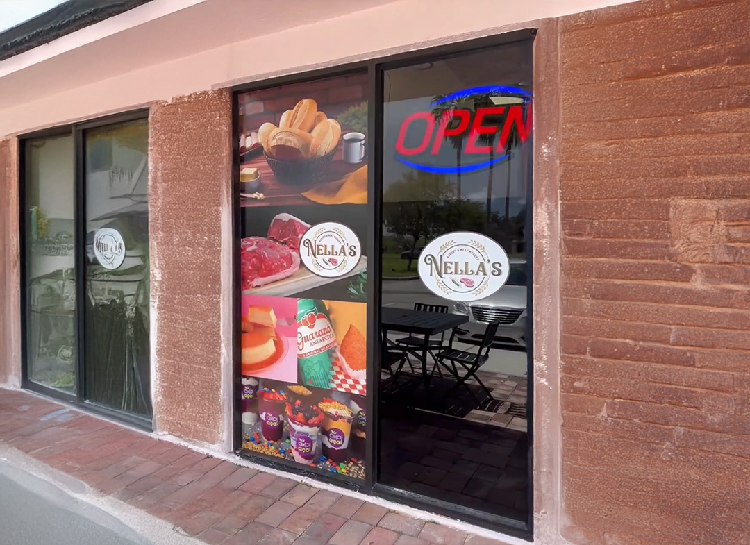 Vibrant vinyl graphics for window branding.